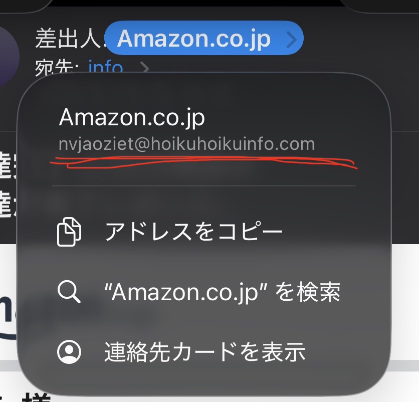 表向きはAmazon.co.jpですが、差出人をタップしメールアドレスを確認すると以下のような画像になります。差出人がAmazonであれば、メールアドレスのドメインも必ず@amazon.co.jpになります