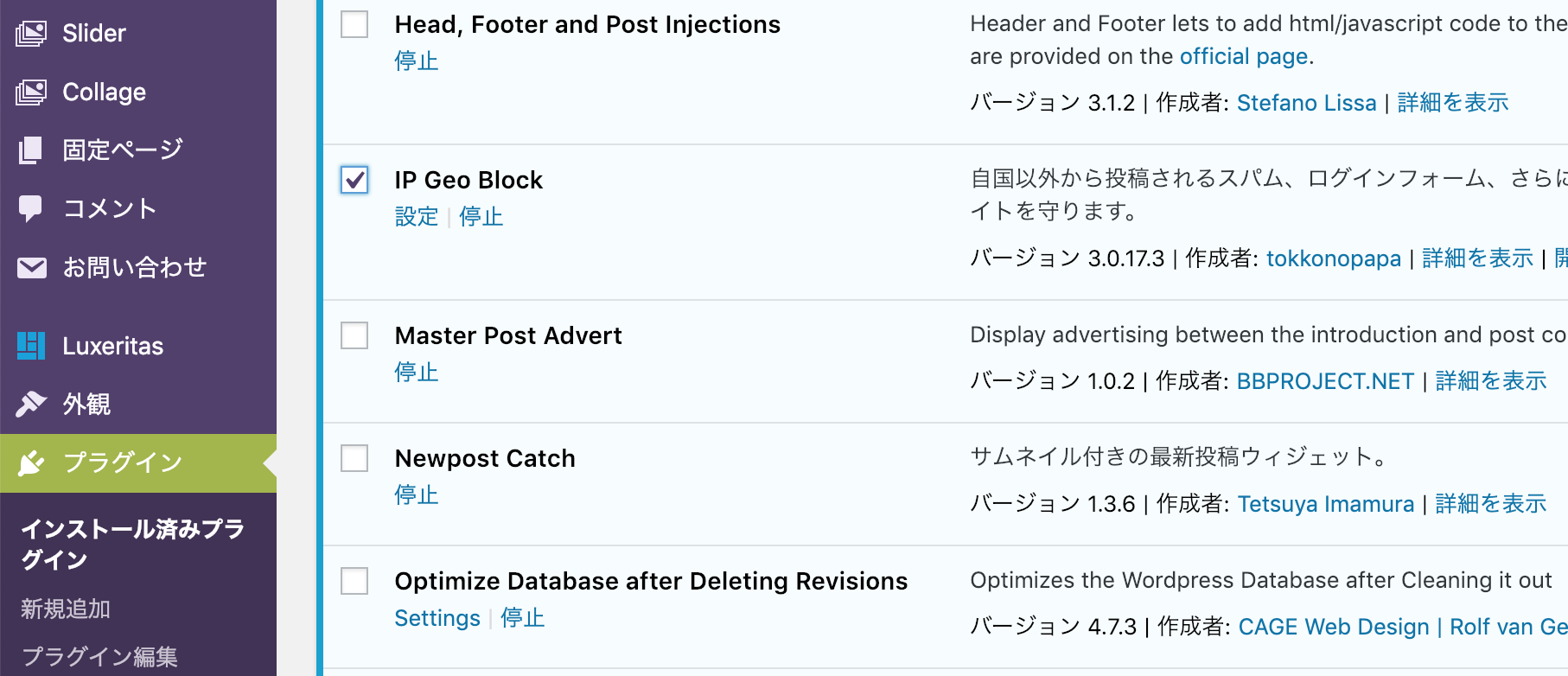 ひとまずプラグインからIP Geo Blockを「停止」です