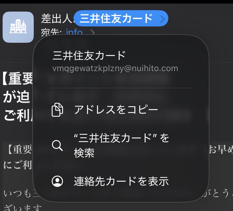 以下画像は、送信元のアドレスです。差出人は「三井住友カード」と記載ありますがメールアドレスはランダムな英数字になっており、公式アカウントからの配信ではないことが分かります。