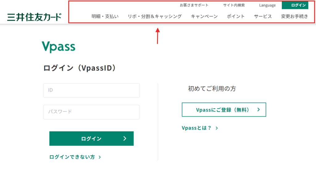まず三井住友カードのログイン画面を見てみましょう。ホームページにはログイン画面の他に、サービスリンクがあります(赤枠部分)