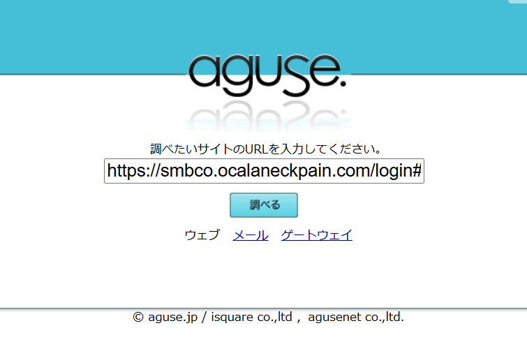 アグースのトップページが開きますので、詐欺メールに記載があるURLをメールからコピペし「調べる」をクリックします。1分ほど時間が掛かりますが、検索が終了するとサイト情報が確認できます。