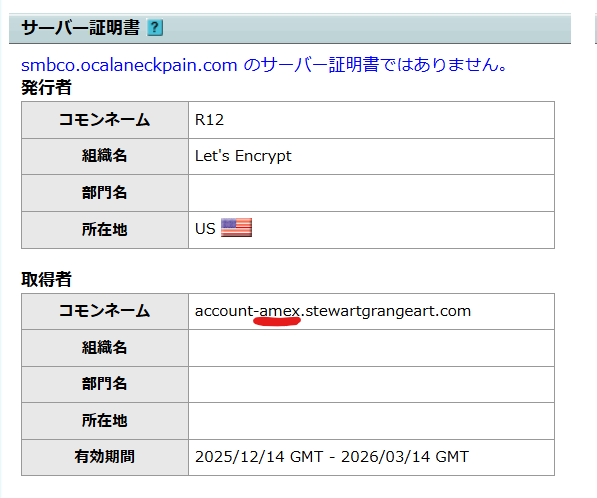 サーバー証明書をチェックしましょう。こちらのサイトは取得者が「account-amex.stewartgrangeart.com」となっています。組織名なし。所在地がなし。