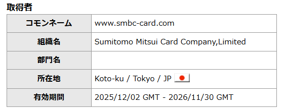 こちらが三井住友カード正規サイトの取得者情報になります。組織名は「Sumitomo Mitsui Card Company,Limited」となっており、組織名、所在地が正しく揃っています。所在地も日本になってることが確認できますね